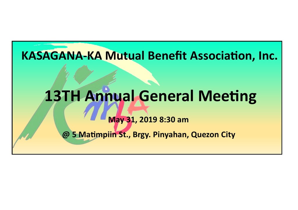 Please be informed that our 13th KMBA ANNUAL GENERAL MEETING is scheduled on MAY 31, 2019, Friday, at the KMBA Building located at 5 Matimpiin St., Barangay Pinyahan, Quezon City to consider and approve the matters set forth in the following agenda: