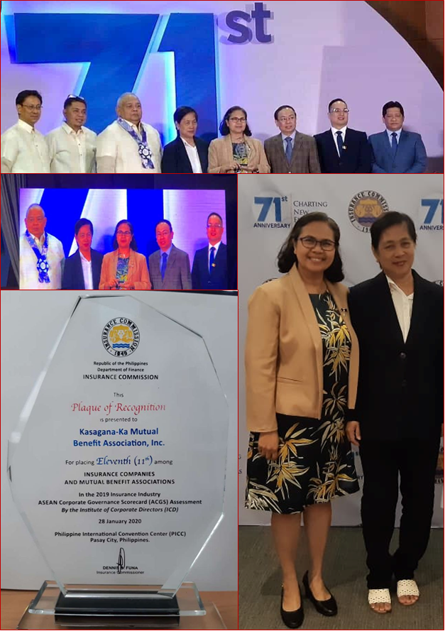 KASAGANA-KA Mutual Benefit Associationwas cited by the Insurance Commission as 11th among insurance companies and mutual benefit associations in the “2019 Insurance Industry ASEAN Corporate Scorecard (ACGS) Assessment by the Institute of Corporate Directors.” KMBA’s partner group, CARD (Center for Agriculture and Rural Development)MBA was recognized as the 6th. Plaques of recognition were given during IC’s 71st anniversary celebration held on 28 January 2020 at the Philippine International Convention Center.