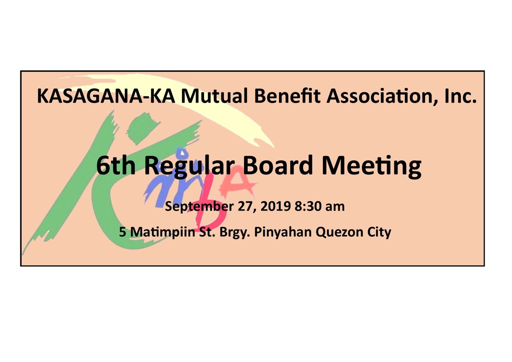 This is to inform you that KMBA will have its 6th Regular Board Meeting on September 27, 2019, 8:30 in the morning located at 5 Matimpiin Street Brgy. Pinyahan Quezon City to discuss the following agenda. Your attendance is highly encourage.