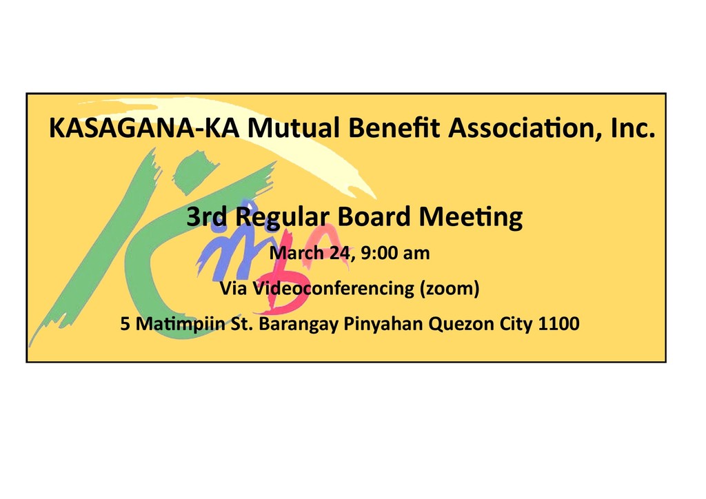 This is to inform you that KMBA will have its 3rd Regular Board Meeting on March 24, 2022 at 9:00 in the morning via zoom to discuss the following agenda.