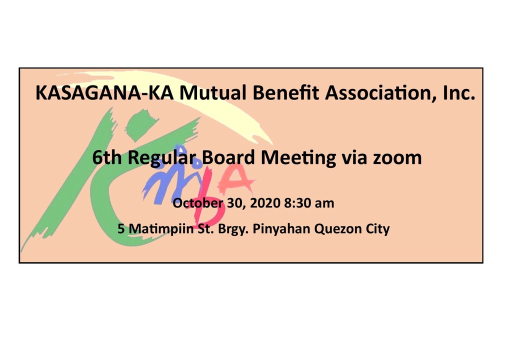 KMBA is inviting you to attend our 6th Regular Board Meeting on October 30, 2020 at 8:30 in the morning to discuss the following agenda.